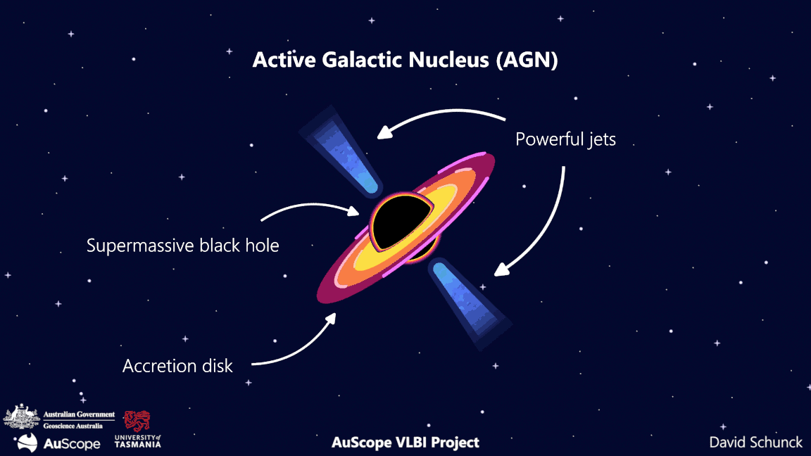 An active galactic nucleus (AGN) is the bright central region of a galaxy powered by a supermassive black hole that pulls in surrounding gas and dust. As this material spirals inward, it forms an accretion disk that heats up and emits intense radiation across the spectrum. Some AGNs launch powerful relativistic jets perpendicular to the disk, shooting out particles. The synchrotron radiation from these jets is what we detect with radio telescopes in VLBI observations. The AGNs we observe with VLBI are extremely distant, typically billions of light-years away. This means the radio waves we detect today left those objects billions of years ago, letting us see them as they were when the universe was much younger. The International Celestial Reference Frame (ICRF) contains precise coordinates of extragalactic radio sources observed with the VLBI technique.